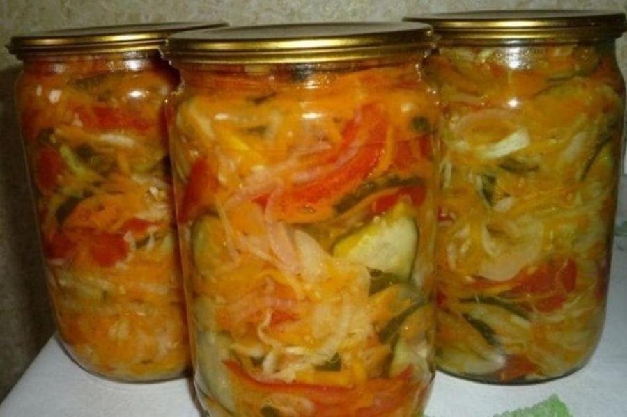 Прокипятите воду и дайте ей остыть. Затем смешайте ее с маслом, сахаром, солью и уксусной эссенцией. Затем добавьте кориандр и порубленный чеснок. Перемешав, дайте постоять. Это нужно для растворения кристалликов. Промойте овощи и зелень. Огурцы желательно порезать кружочками. Перец и лук - полосками. Порубите зелень. Возьмите большую емкость и сложите туда овощи и зелень. Залейте все маринадом. Хорошо смешайте и дайте постоять полтора часа под крышкой. Перемешивайте каждые полчаса. Овощи разложите по чистым банкам вместе с жидкостью․Дно кастрюли застелите полотенцем. Ставьте туда банки и прикрывайте простерилизованными крышками. Воду лейте до плечиков банок. Доводите до кипения на слабом огне. Заготовки оставьте на 10 минут. Закатайте банки их храните их перевернутыми, укутанными в одеяло до полного остывания.