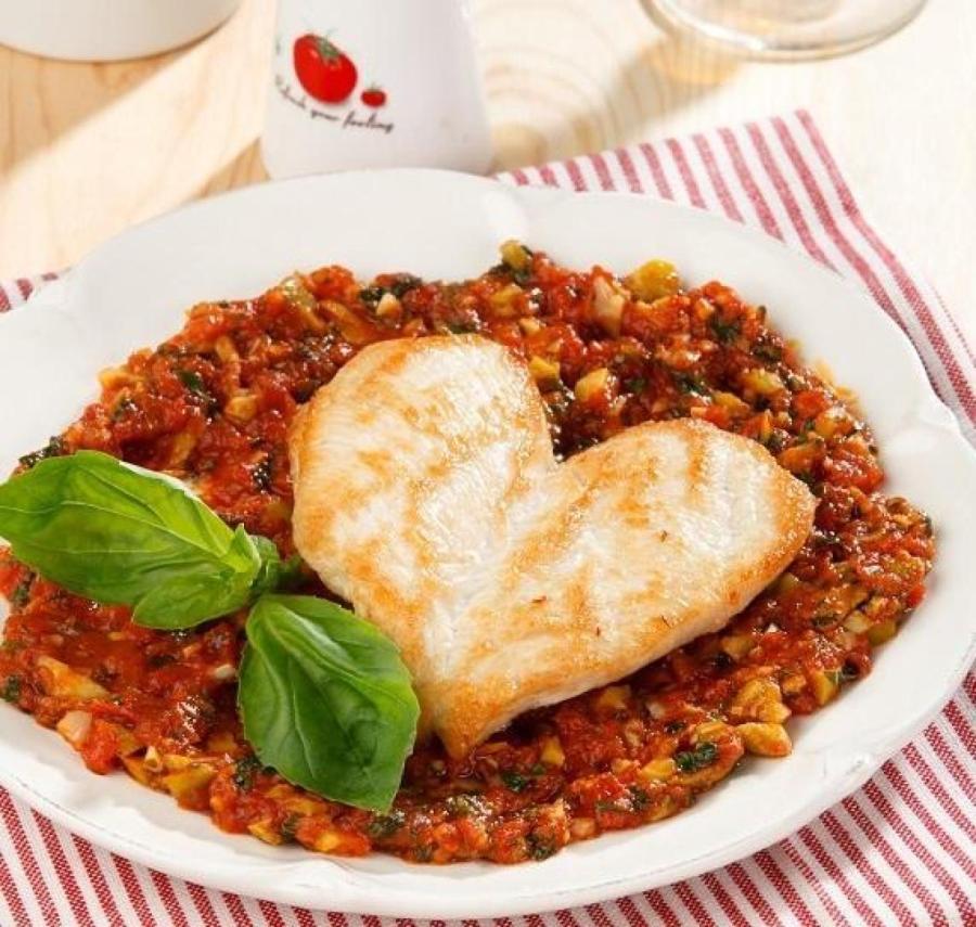 1. Куриное филе вымыть, обсушить. Разрезать вдоль, но не до конца, распластать его на разделочной доске и обрезать по форме сердца. Курицу поперчить, посолить и обжарить на сковороде до готовности (до золотистого цвета). Филе накрыть крышкой и сохранять теплым.