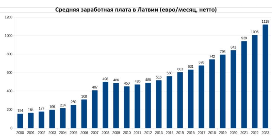 В свою очередь, средняя нетто-зарплата, то есть после уплаты налогов, в 2023 году составила в Латвии 1119 евро, или 72,9% от брутто-зарплаты. За год средняя нетто-зарплата выросла на 11,3%, однако с учетом инфляции реальный прирост нетто-зарплаты составил 2,2%.