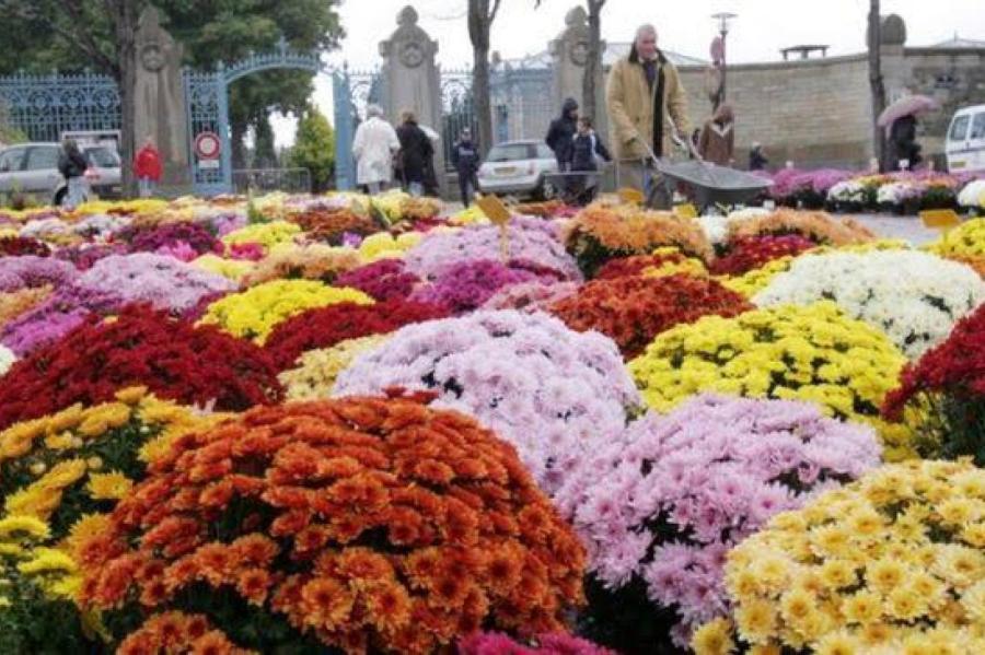В этот период во всех французских садовых центрах, супермаркетах, на рынках и прямо перед кладбищами идёт бойкая торговля хризантемами. Да, хризантемы во Франции - цветы для кладбища. Стоимость горшка с цветком - в среднем от 14 до 25 евро. В эти выходные кладбища Франции украсят яркие пышные шапки тысяч хризантем. Их ставят на могилы прямо в горшках и они ещё долго радуют своими красками живых и мертвых.