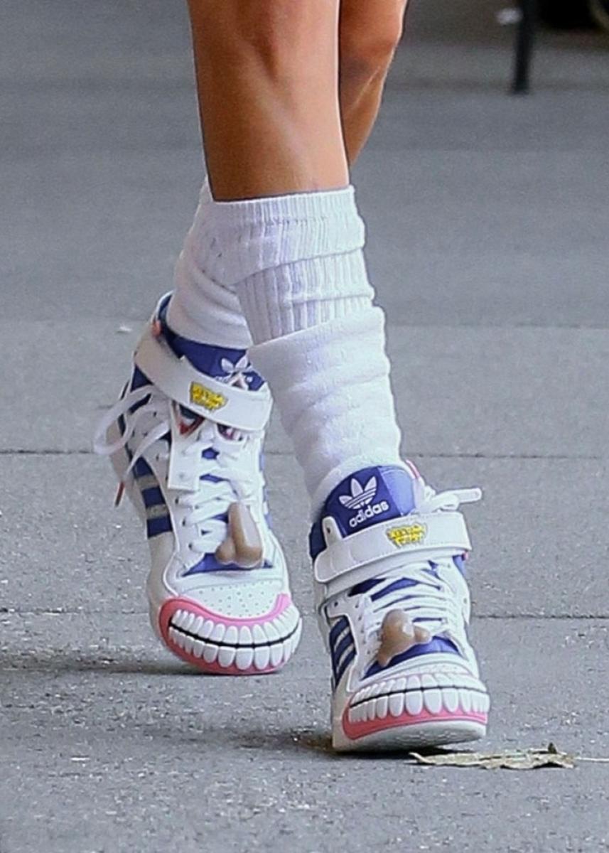 На улицах Нью-Йорка Хадид-младшая появилась под руку с бойфрендом Марком Колманом в обуви из коллаборации Kerwin Frost x Adidas Forum High. Высокие кроссовки отличает «грим»: вставные зубы, накладной нос на шнурках и нарисованные глазки. За кадром — копна волос, которая свисает на пятке.