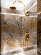 В квартире две спальни, две ванные комнаты — одна черная, другая золотистая, большая кухня, совмещенная с гостиной, и прекрасная терраса, которую можно легко превратить в столовую.