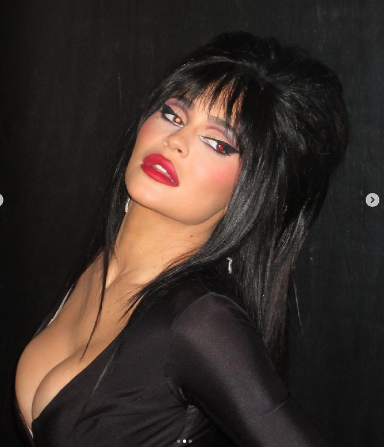 Кайли Дженнер продемонстрировала очередной шикарный образ на Хэллоуин. Она выбрала, пожалуй, самый узнаваемый костюм – наряд Эльвиры, повелительницы тбмы из одноименного фильма.