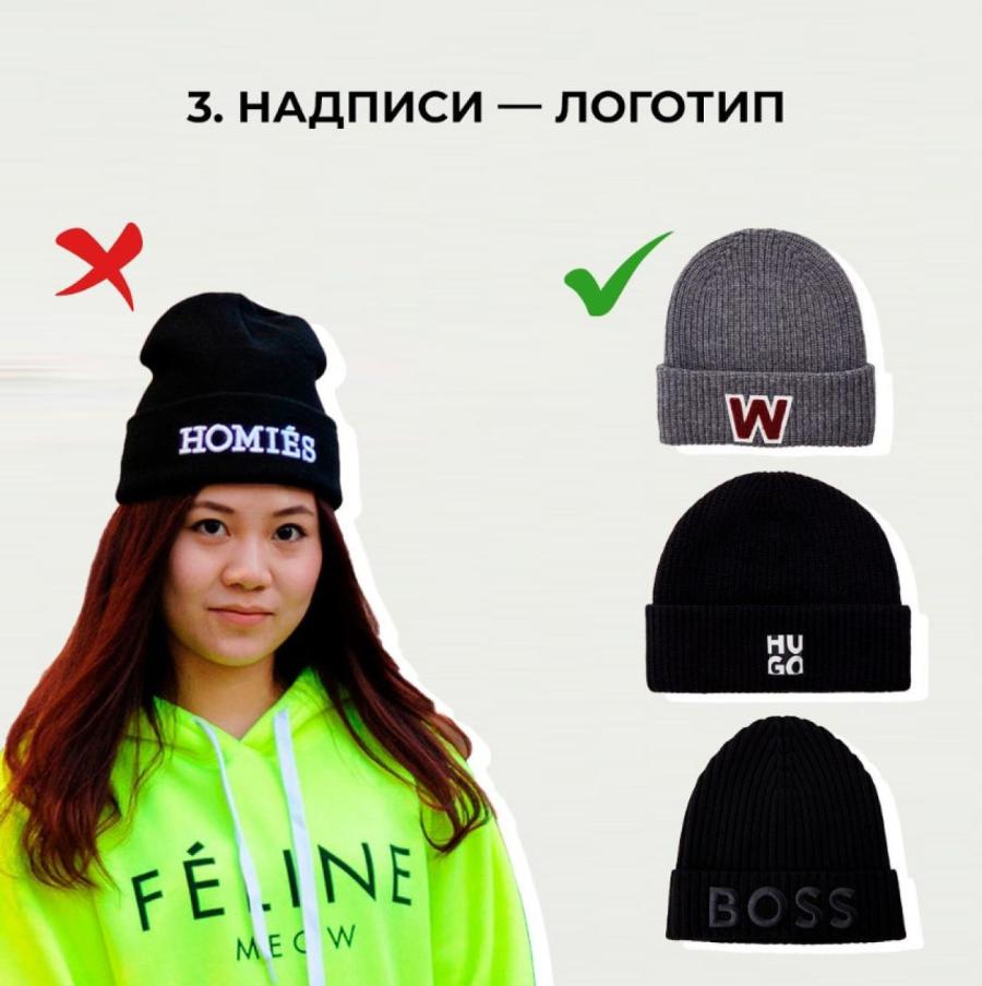 Головные уборы, размалеванные крупными надписями и рисунками – пережиток прошлых дней и сейчас эта аляповатость не в моде. Чем проще шапка, тем более дорого и стильно она смотрится. Для тех, кто считает однотонные головные уборы слишком скучными, Тан советует присмотреться к шапкам с логотипом бренда. В идеале это – не очень крупные надписи базовых цветов.