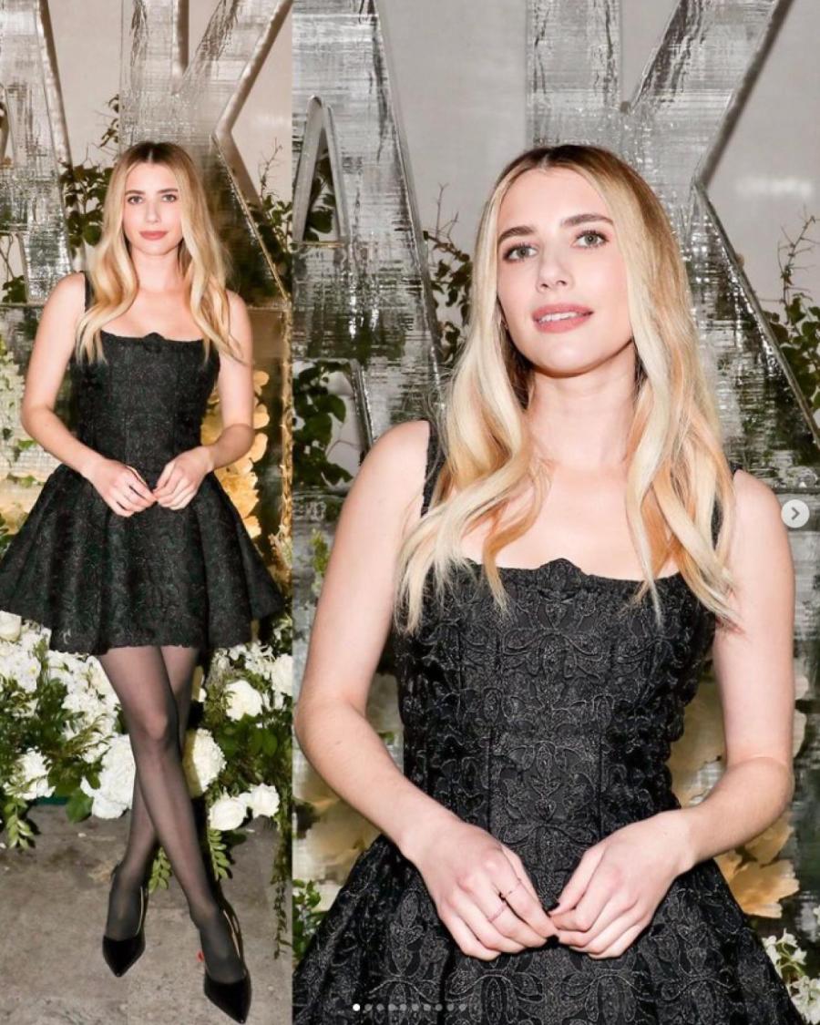 Для выхода на публику молодая мама выбрала черное мини-платье с темными колготками. Волосы актрисы были распущены, а на лице она сделала легкий макияж. На ногах Эммы Робертс были черные замшевые туфли-лодочки. В качестве аксессуаров к вечернему аутфиту звезда выбрала лаконичные кольца.