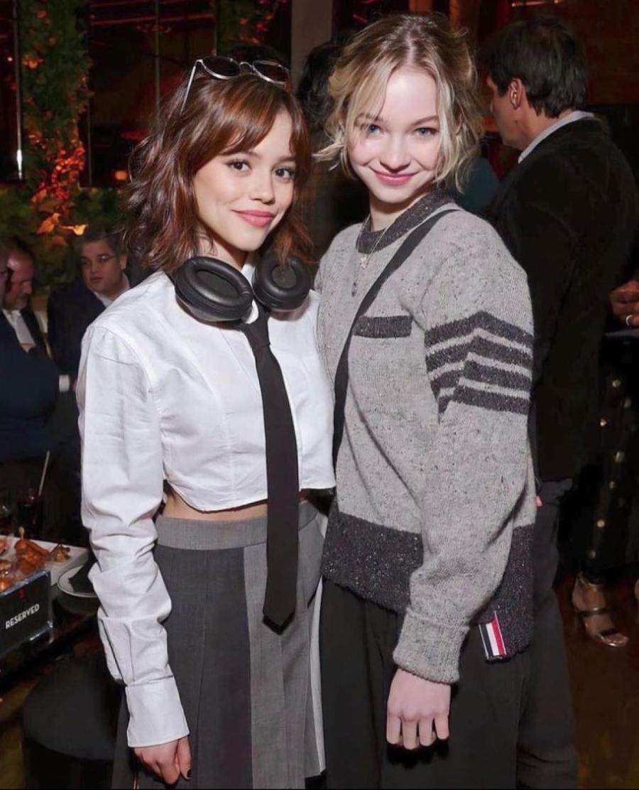 На мероприятии к Ортеге присоединилась ее коллега по фильму Эмма Майерс, сыгравшая ее соседку по комнате – оборотня Энид Синклер.