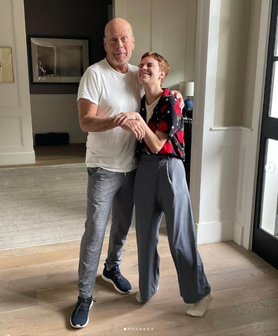 На кадрах Брюс позирует в белой футболке, серых спортивных штанах и кроссовках в обнимку с дочерью. На ней – белый топ, черная в красные цветы блуза с коротким рукавом и широкие серые штаны.