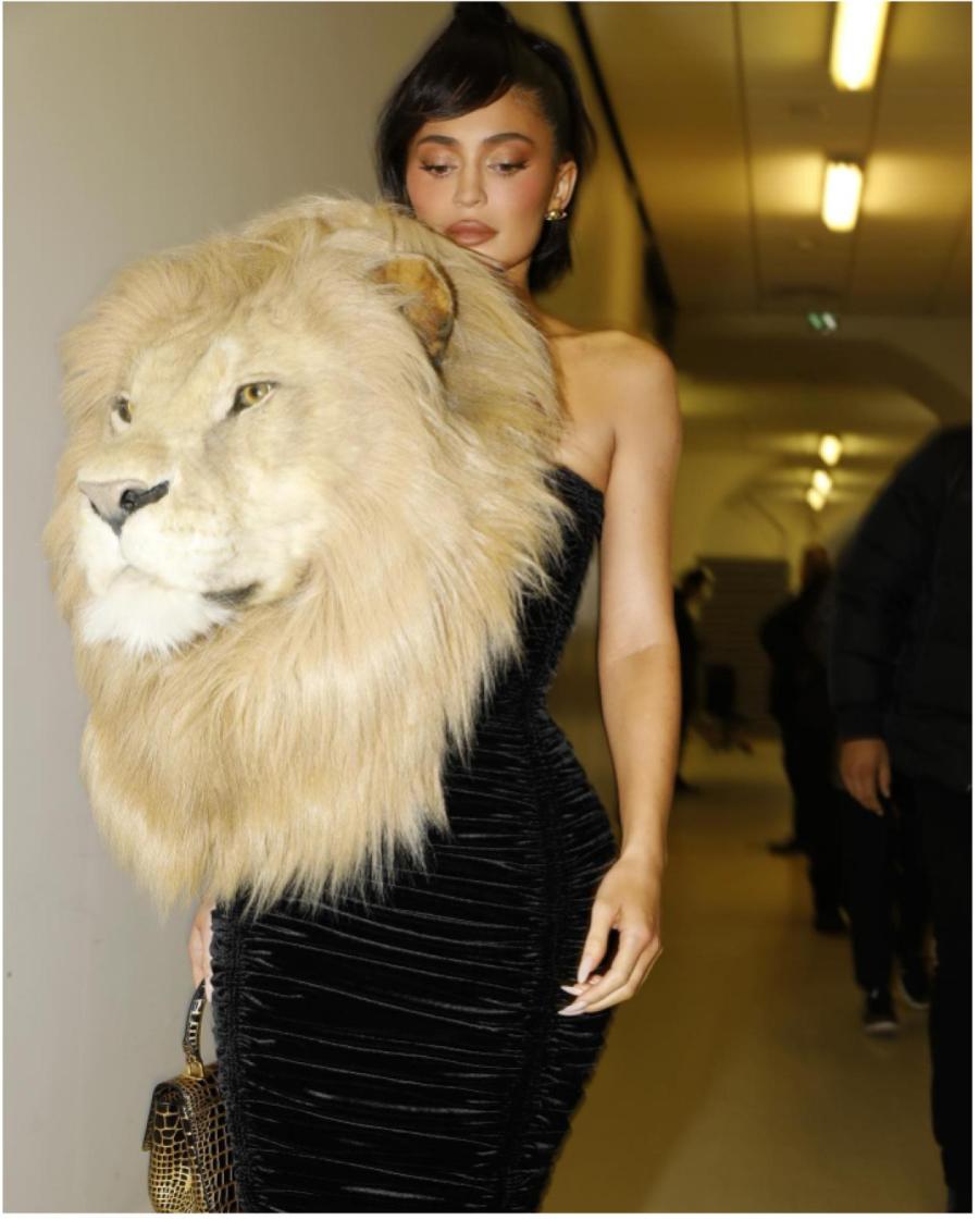 Показ новой коллекции Schiaparelli во время Недели моды в Париже запомнится не только сногсшибательными образами, но и нарядами публики. К примеру, 25-летняя модель и бизнесвумен Кайли Дженнер, ставшая гостьей мероприятия, наблюдала за своими коллегами-моделями, шагающими по подиуму, в черном платье без бретелей, декорированном огромной головой льва, которая практически ничем не отличалась от настоящей.