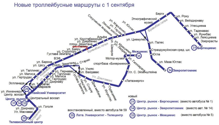 Автобусный маршрут № 5, идущий от центра через Пурвциемс в Межциемс станет троллейбусным маршрутом № 35.