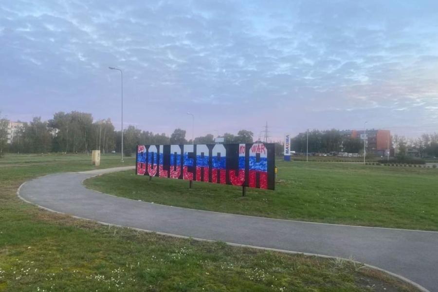 Государственная полиция начала уголовный процесс против неустановленных вандалов, которые прошедшей ночью раскрасили указатель столичного микрорайона "Болдерая" в цвета российского флага.