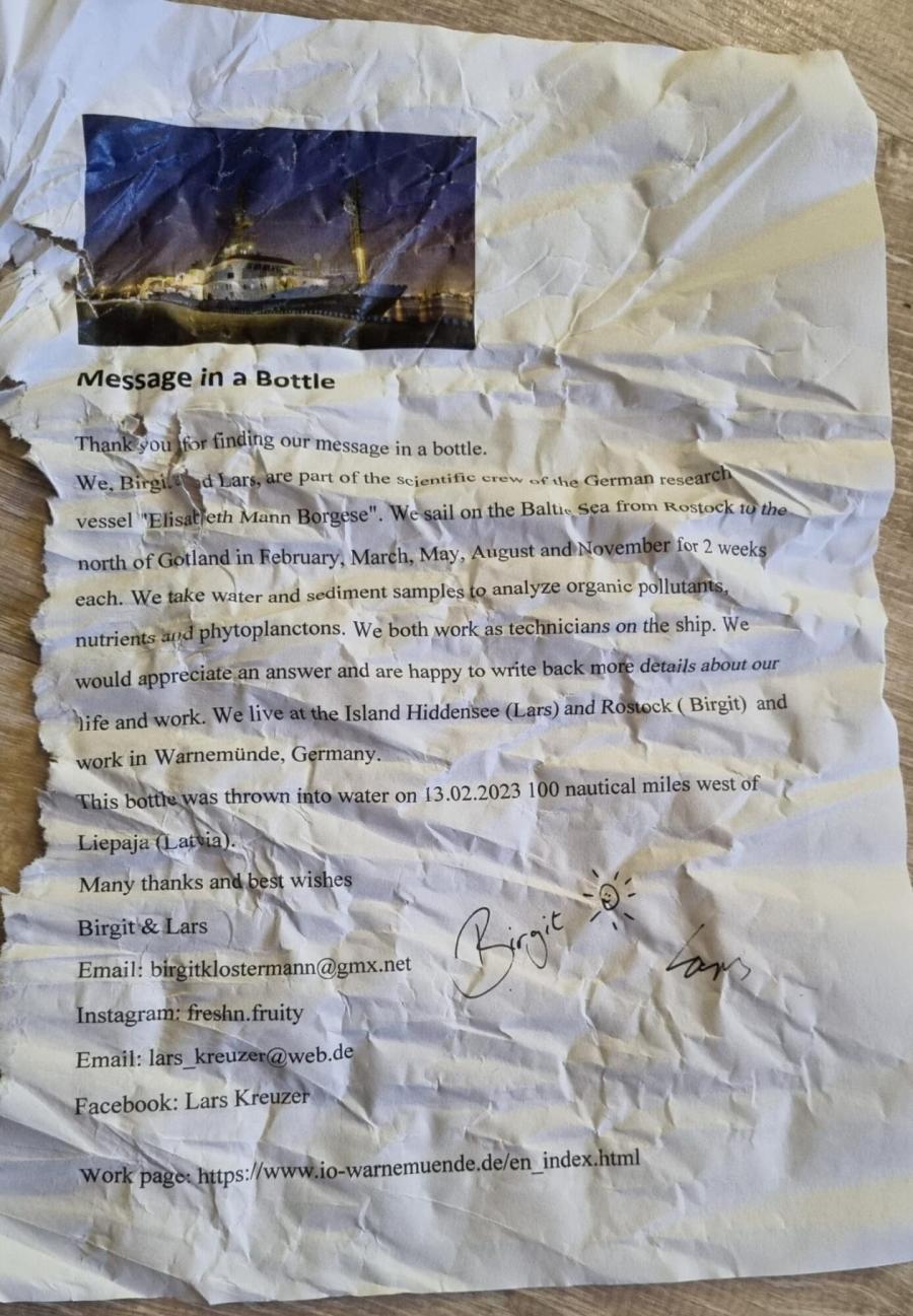 Письмо написано на английском языке, и его авторы Биргита и Ларс. «Мы часть команды ученых немецкого исследовательского корабля Elisabeth Mann Borgese», пишут они.