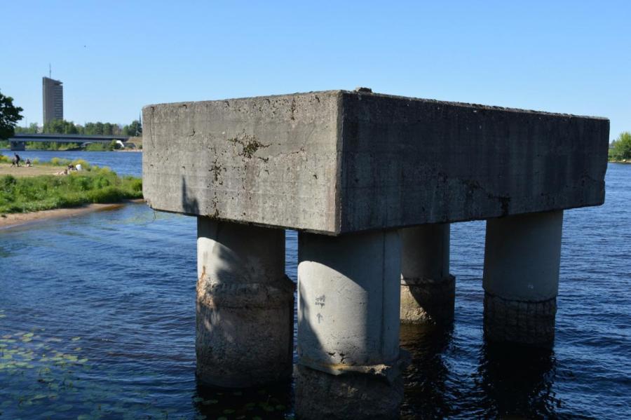 А на бережке Даугавы видны циклопические бетонные объекты. Некоторые изрисованы граффити, другие величаво покоятся в воде как рукотворный остров. Осыпавшиеся верхушки свай стали напоминать античные капители. Тысячи тонн железобетона, на глаз — и без ясной функции. Когда и зачем их возвели?