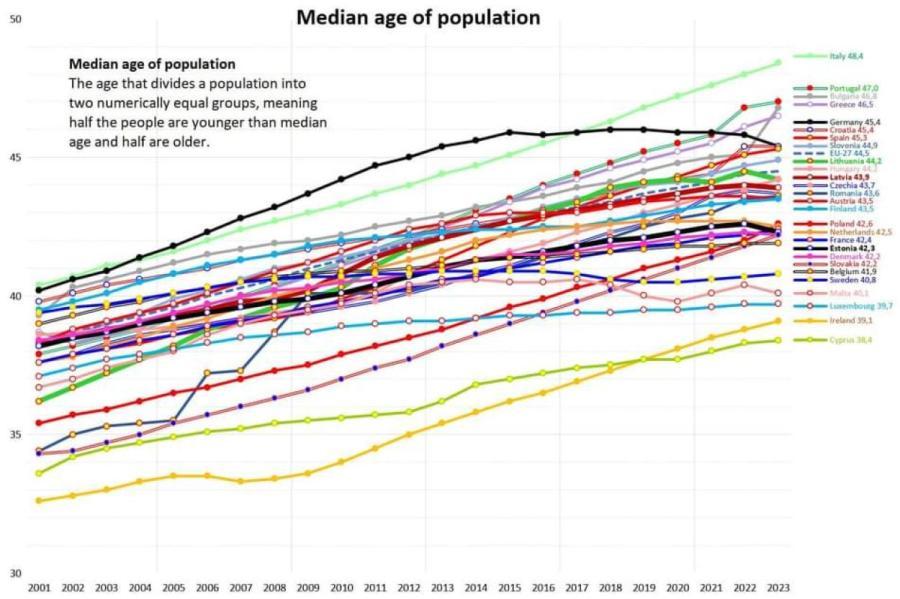 Эксперт Латвийской конфедерации работодателей Янис Херманис в социальных сетях опубликовал график "старения" в странах ЕС. Речь идет о среднем возрасте населения во всех 27 странах Евросоюза. Согласно европейского статистического агентства, в ЕС продолжается стремительное старение населения. Самой "старой" страной ЕС является Италия - средний возраст жителей 48,4! На втором месте Португалия - 47,0. Тройку самых старых стран по возрасту жителей замыкает Болгария - 46,8.