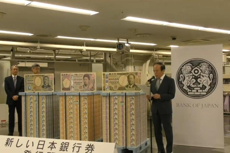 Премьер-министр Фумио Кисида приветствовал современные функции защиты от подделки новых банкнот номиналом 10 000, 5 000 иен и 1 000 иен.